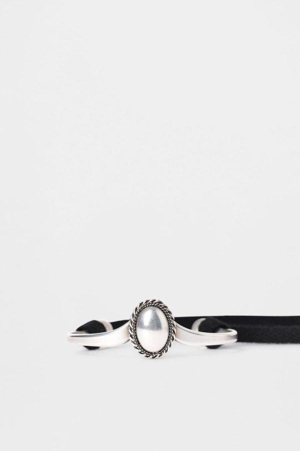 Leja Cabochon Bracelet – Antique Silver And Grosgrain – Silver Cabochon – Engraved Logo- Plaque – 100% Silver – Made in Italy