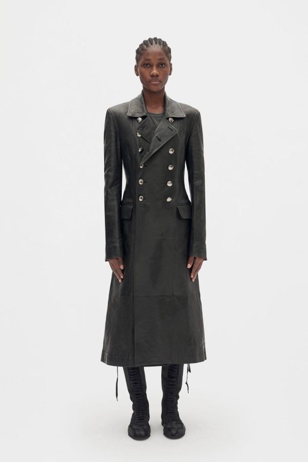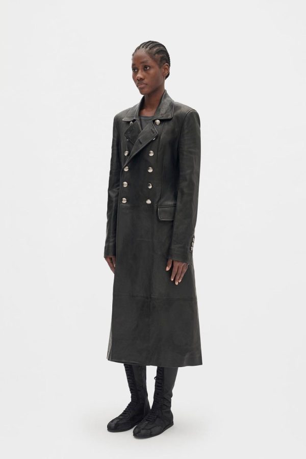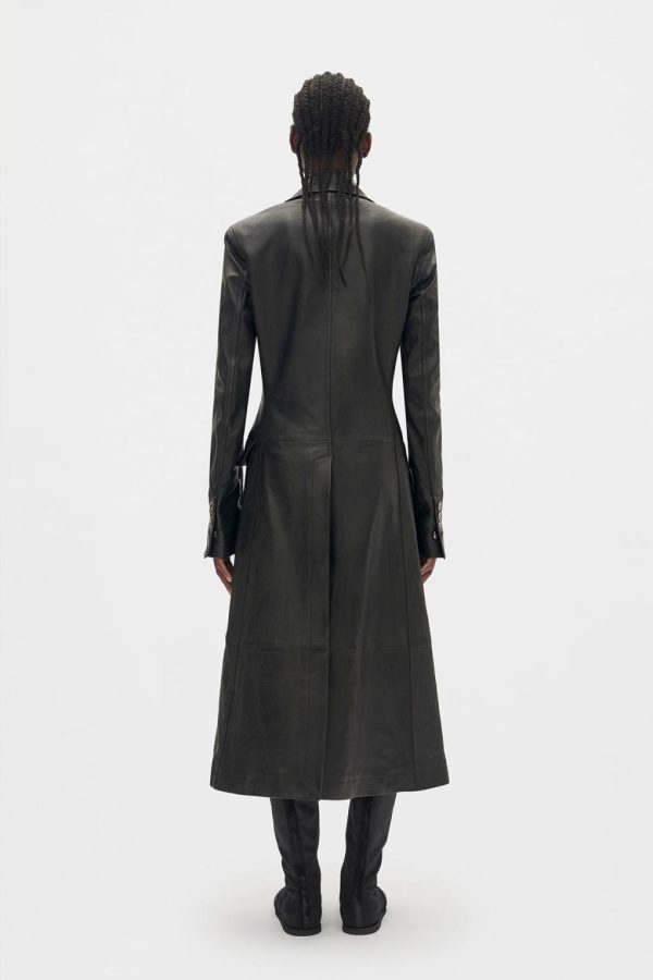 Adelita Double-Breasted Trench Coat – Black – Vintage Lux Grained Leather – Notched Collar – Double-Breasted – Metal Button Closure – Side Flap Pockets – Buttoned Cuffs – Back Split – 100% Lambskin – Made in Italy<