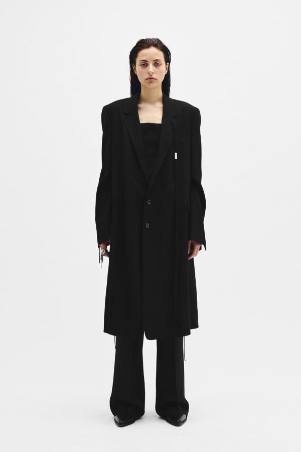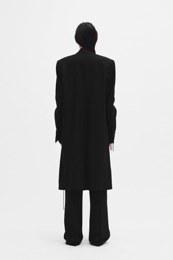 Viv High Comfort Tailored Coat – Black- Viscose Calico – Notch Lapels – Padded Shoulders -Removable Signature Grograin Ribbon – Button Closure – Chest Pocket – Side Flap Pockets – Slouched Sleeves – Buttoned Cuffs – Back Split -100% Viscosa – Made in Italy