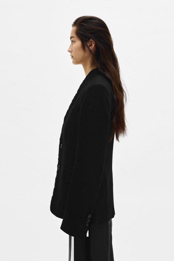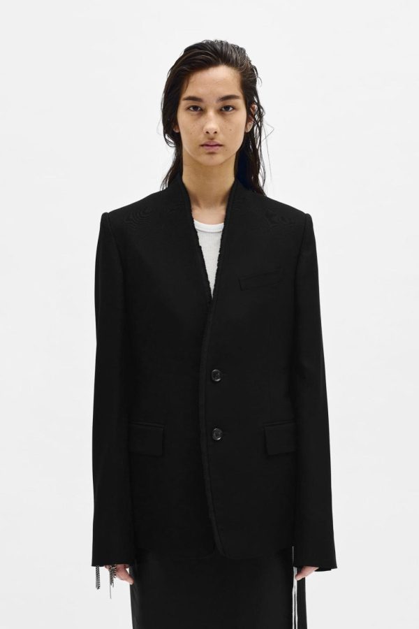 Sady Collarless Fitted Jacket – Black – Viscose Calico – Frayed Edges – V-Neck Padded Shoulders – Button closure chest pocket side flap pockets dropped shoulders buttoned cuffs back split slim fit – 100% Viscose – Made in Italy