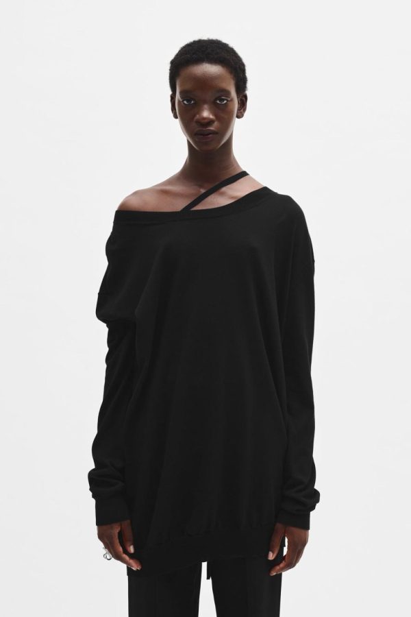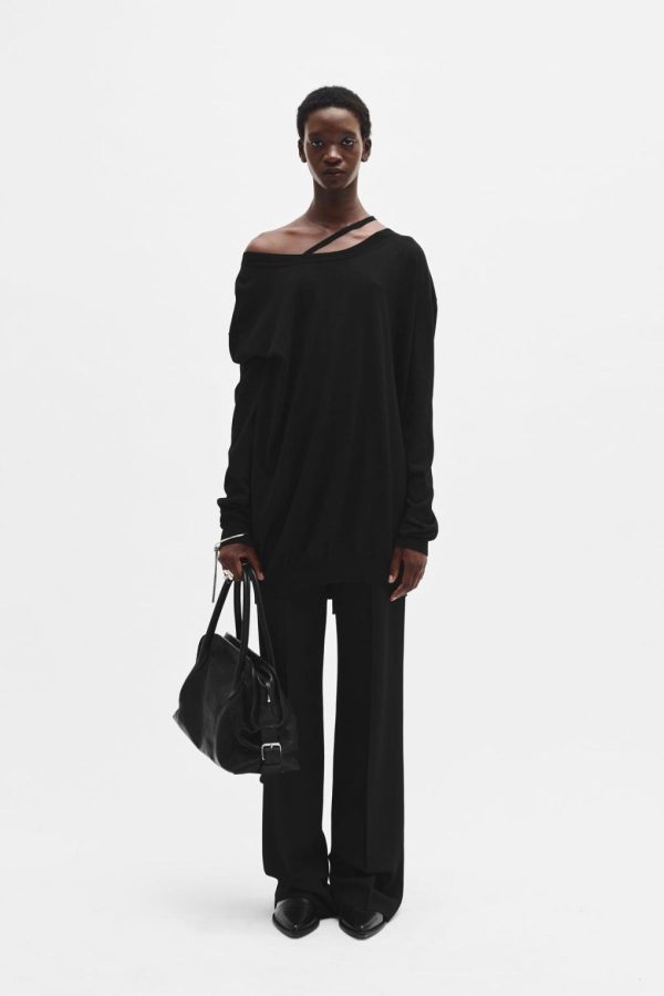 Helle High-Comfort Sweater – Black – Off-The-Shoulder Crewneck – Internal Grosgrain Shoulder Strap – Dropped Shoulders – Ribbed Hem And Cuffs – Loose Fit – 50% Cotton,30% Wool,20% Silk – Made in Italy