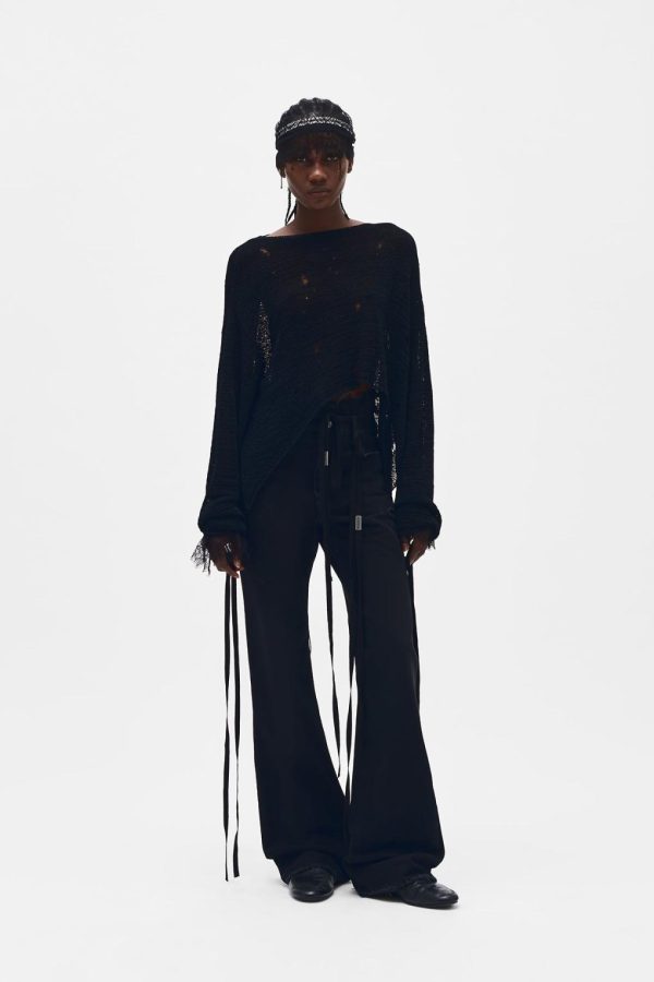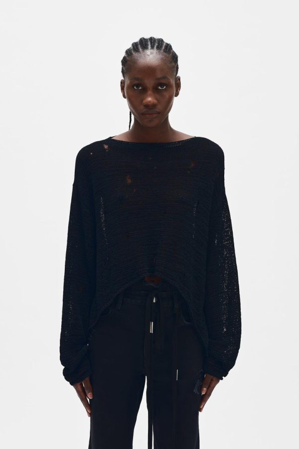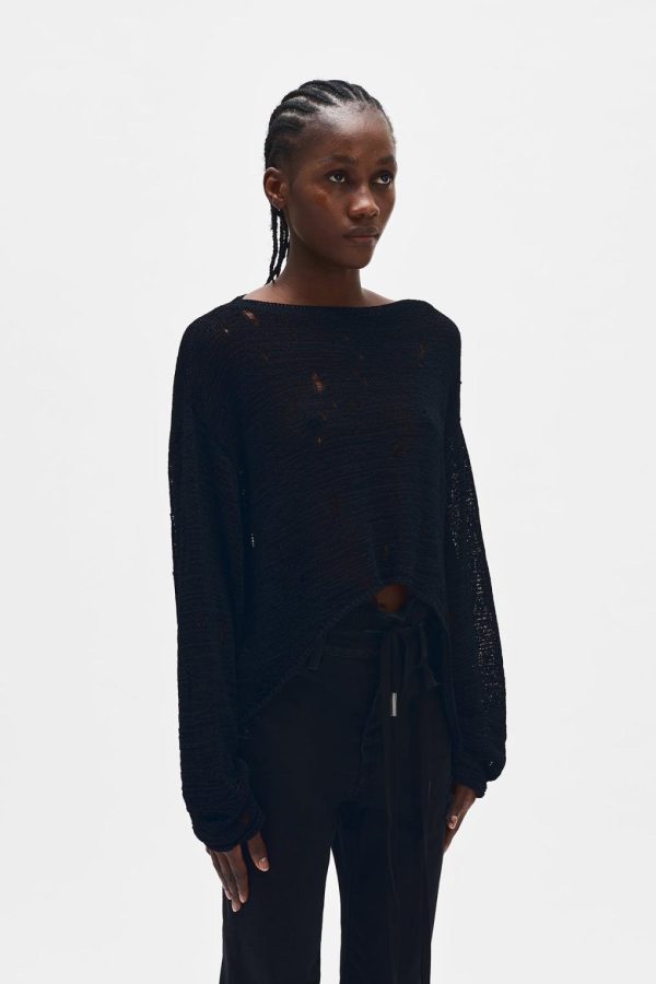 Loa Open Neck Sweater – Black – Viscose Corduroy Knit – Distressed Details – Boat Neck – Cropped Asymmetric Hem – 60% Viscose 40% Polyamide – Made in Italy
