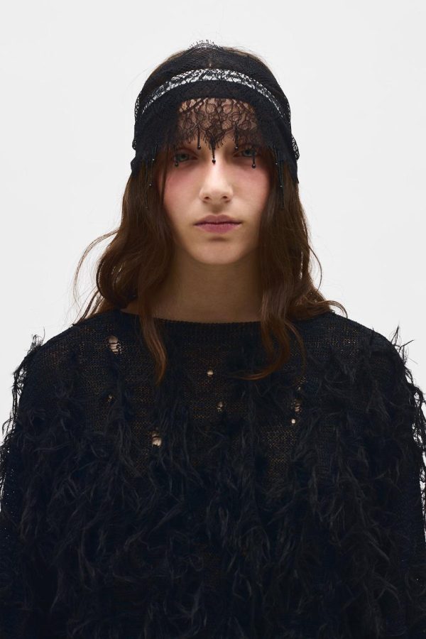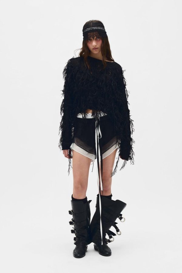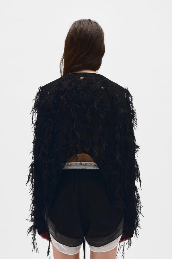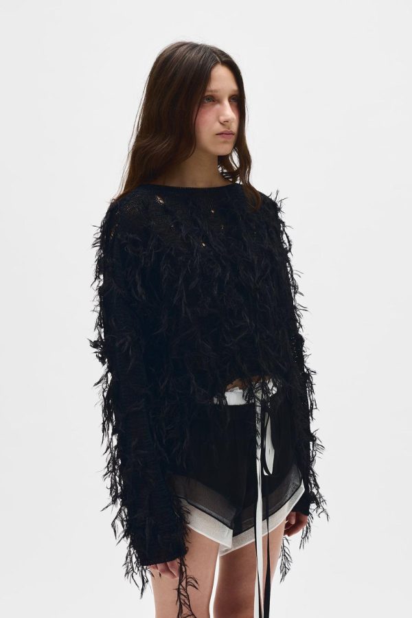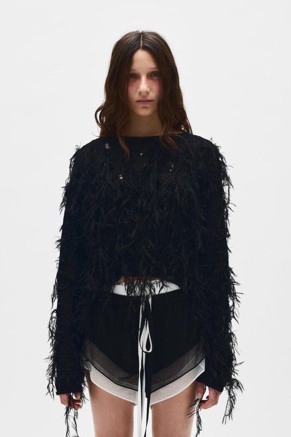 Vilta Sweater – Black – Viscose Nylon Knit – Embroidered Faux Feathers – Boat Neck -Cropped Hem – Relaxed Boxy Fit – 60% Viscose 40% Polyamide – 80% Mohair 20% Polyamide – Made in Italy