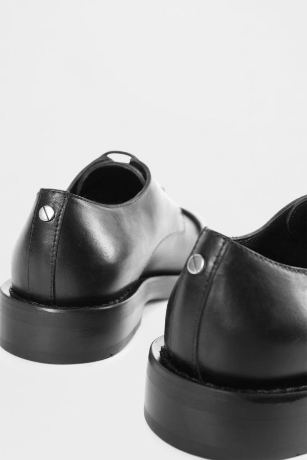 Kai Pintuck Derby Shoes – Black – Tuxon Leather – Lace Closure – Front Pintuck – Back Signature Rivet – Leather Sole – Block Heel – 100% Calf Leather – Made in Italy