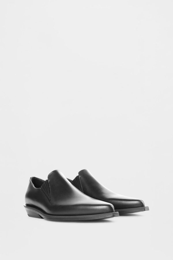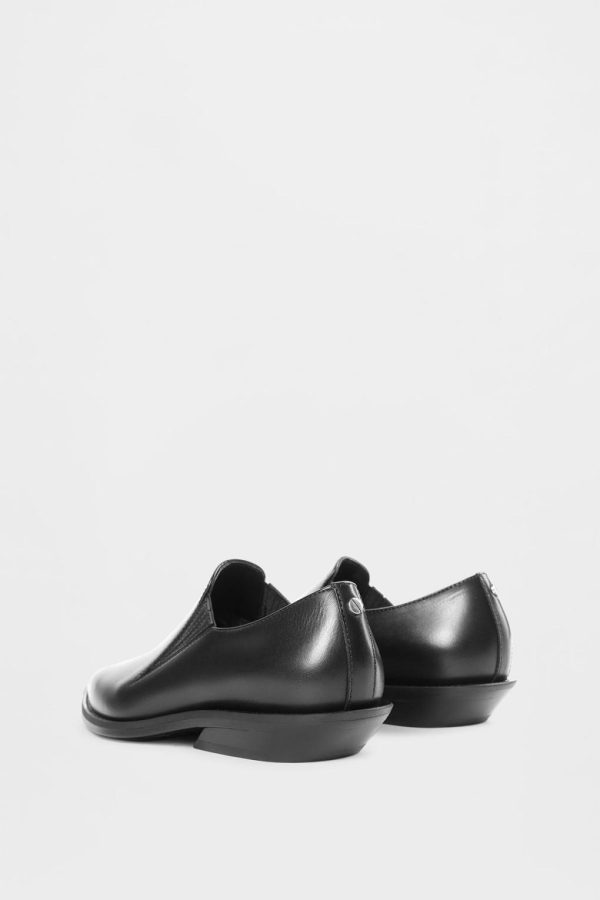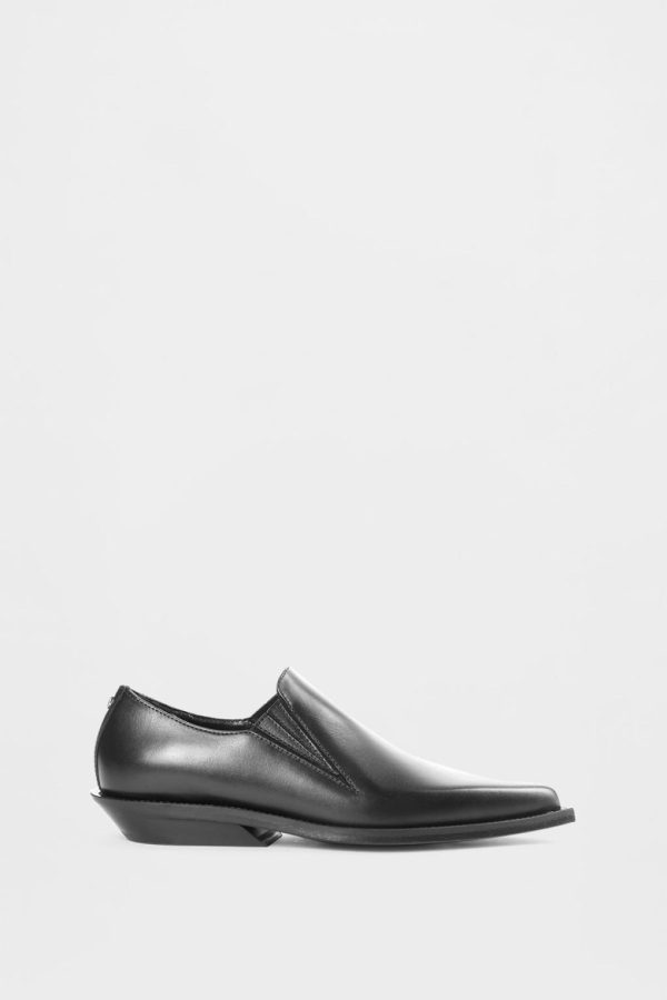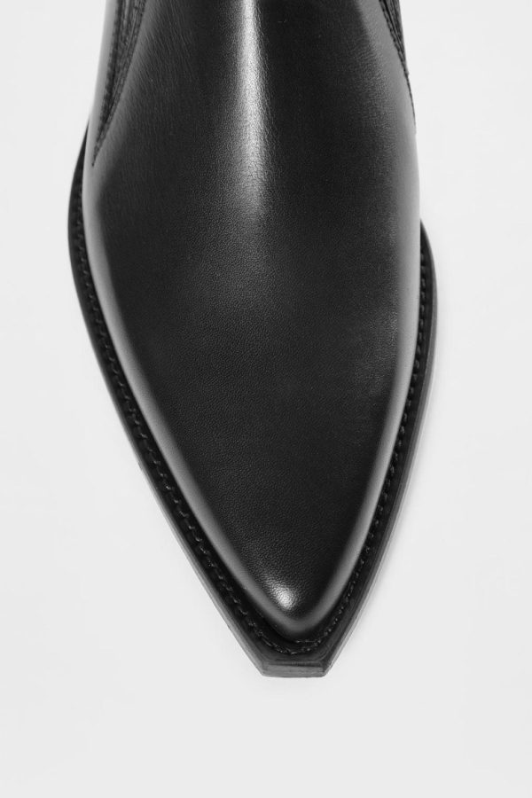 Makea Pointy Cowboy Shoes – Black – Vintage Matte Calfskin – Pointed Toe – Back Signature Rivet – Side Covered Elastic Gussets – Leather Sole – Slanted Block Heel – 100% Calf Leather – Made in Italy