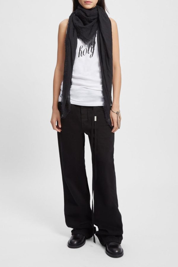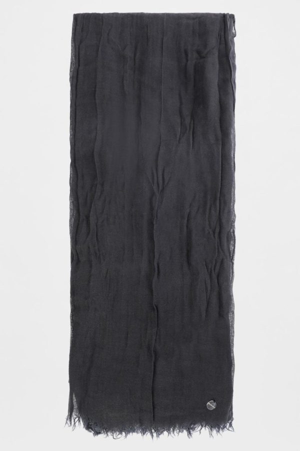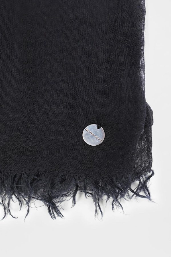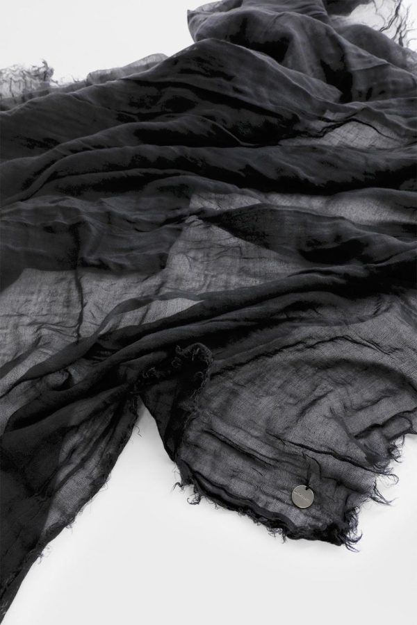 Vesta Squared Scarf – Black – Crinkled Sheer Cotton – Modal Cashmere Knit – Engraved Logo Coin – Fringed Ends -140×140 – 50% Cotton, 45% Modal, 5% Cashmere – Made in Italy