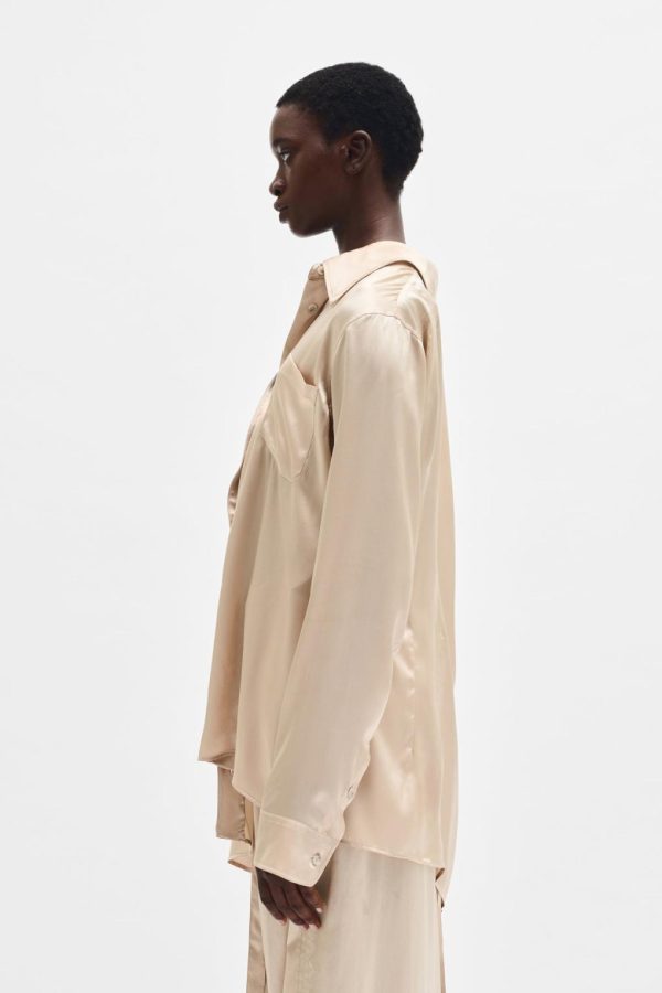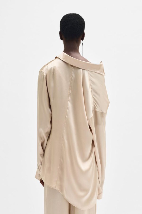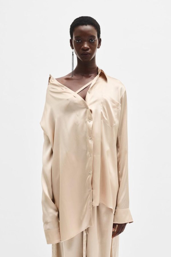 Daria Drop Shoulder Shirt – Dusty Nude – Washed Silk Satin – Classic Collar – Off-The-Shoulder Neckline – Button Closure – Chest Pocket – Dropped Shoulders – Long Sleeves – Buttoned Cuffs – Asymmetric Hem – Draped – Loose Fit – 100% Silk – Made in Italy