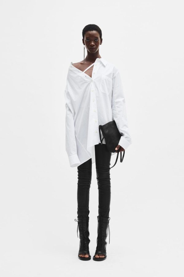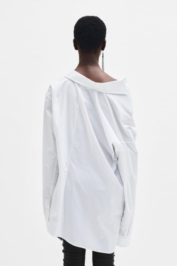 Daria Drop Shoulder Shirt – White – Cotton Poplin – Classic Collar – Off-The-Shoulder Neckline – Button Closure – Chest Pocket – Long Sleeves – Buttoned Cuffs – Asymmetric Hem – Draped – Loose Fit – 100% Cotton -Made in Italy