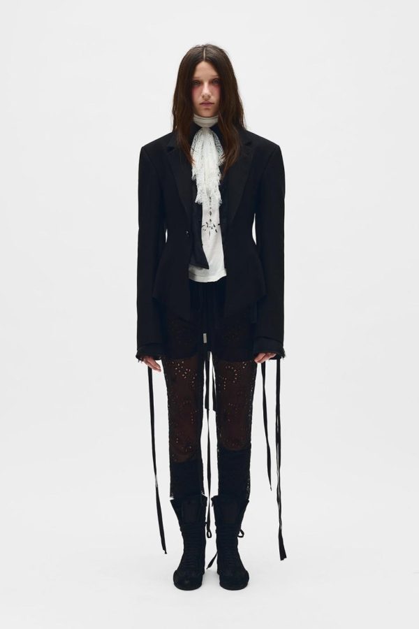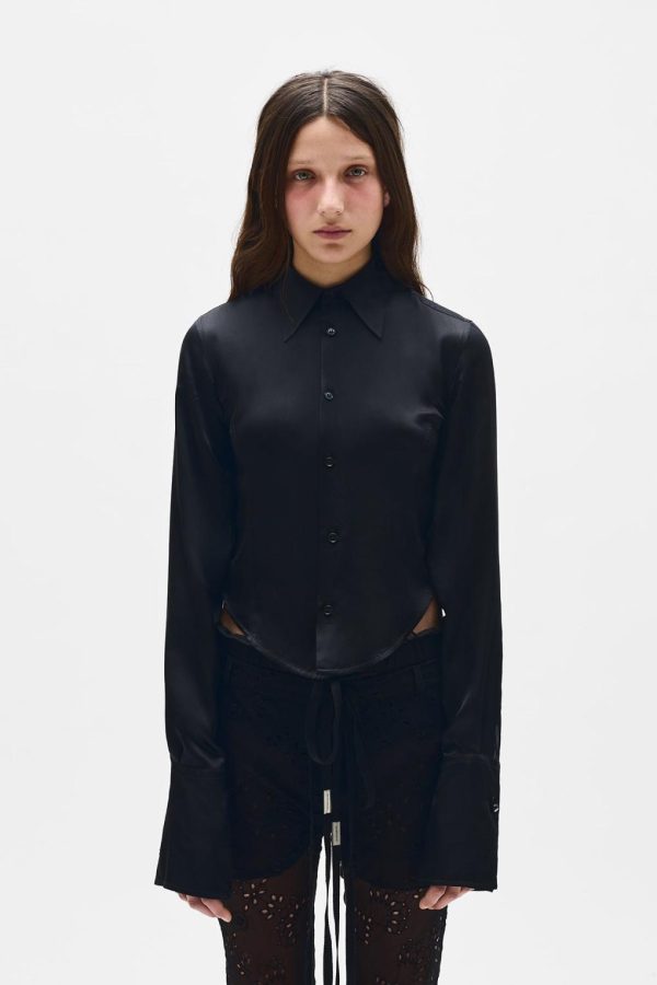 Kersti Shirt – Black – Light Satin – Classic Collar – Button Closure – Darted – Elongated Long Sleeves – Buttoned French Cuffs – Slim Boxy Fit – 100% Silk – Made in Italy