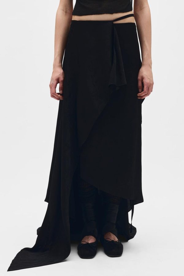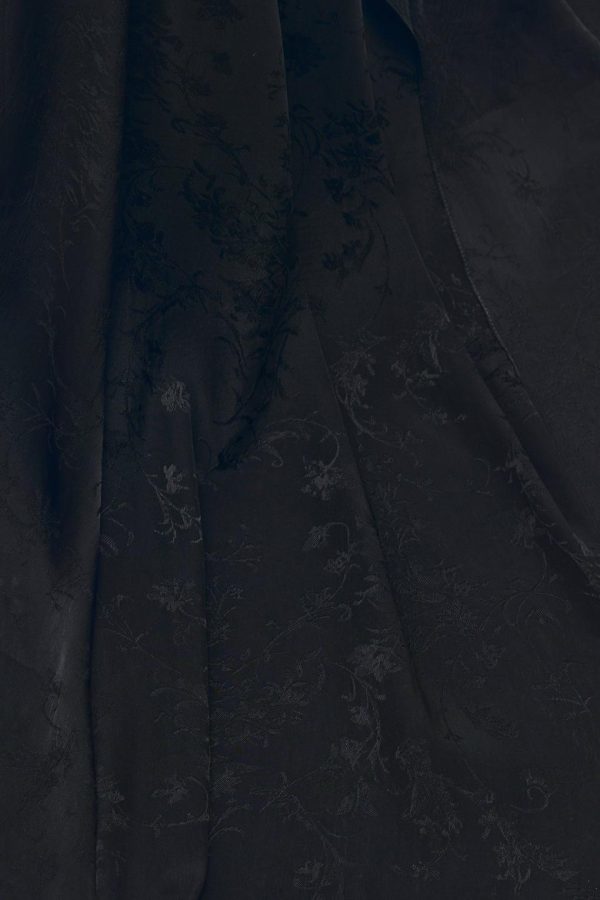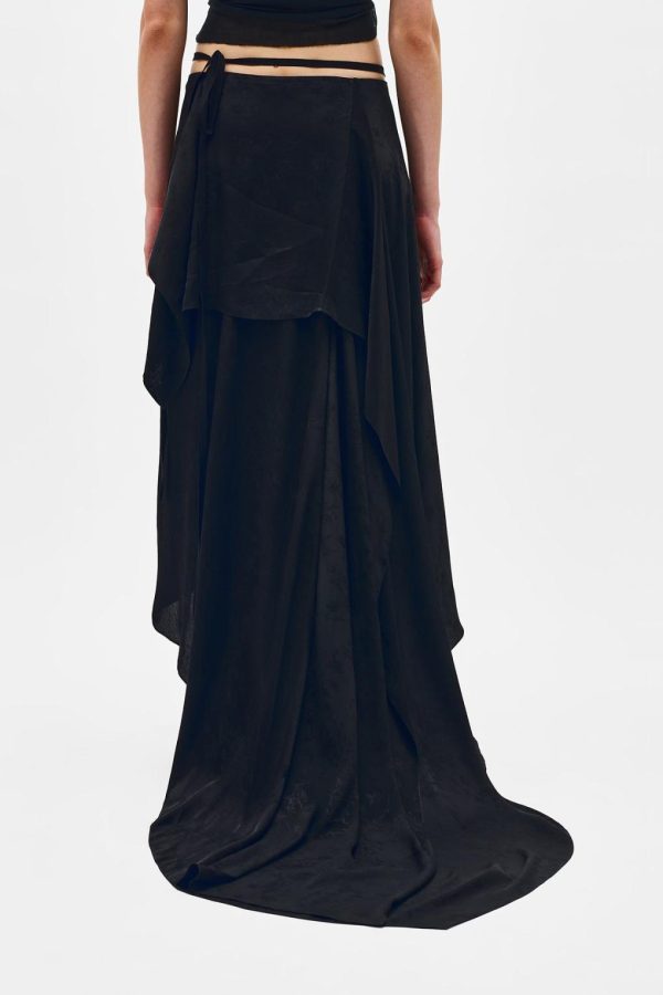 Sirka Deconstructed Asymmetric Skirt – Black – Ramage Jacquard – Front Ruffled Signature Self-Tie Wrap – Signature Self-Tie Grosgrain Belt – Asymmetric Hem – Back Draped Trail – Floor Length – 79% Viscose 21% Silk – Made in Italy