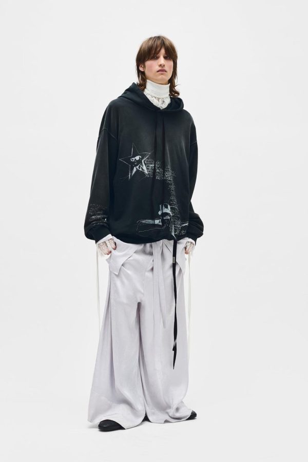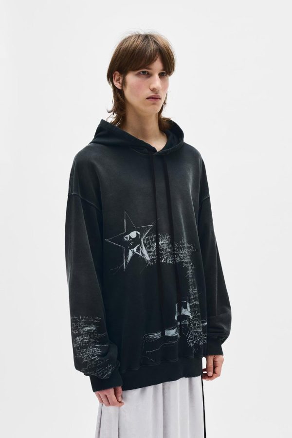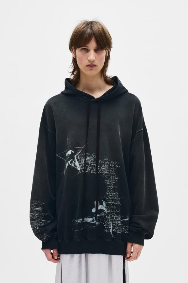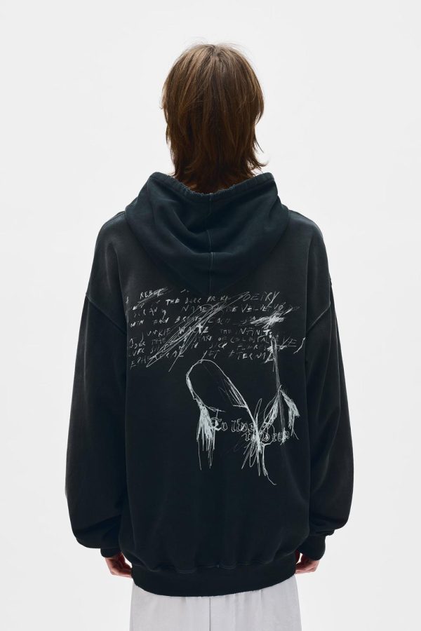 Olly ”Sketchbook” High-Comfort Hoodie – Black – Distressed Details – Hood With Drawstrings – Sketchbook Print – 100% Cotton – Made in Portugal