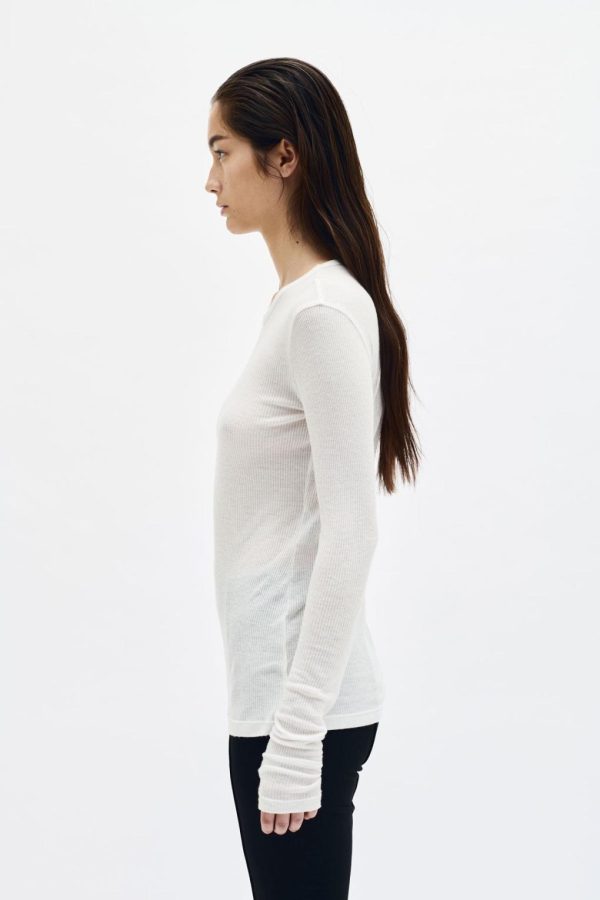 Fiene Long Sleeve T-Shirt – Natural White – Viscose Cotton Rib Jersey – Round Neck – Long Sleeves – Slouched Cuffs – Slim Fit – 75% Viscose, 15% Cotton, 15% Polyamide – Made in Italy