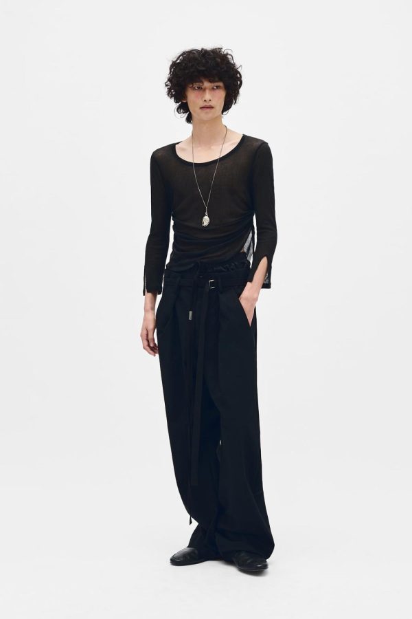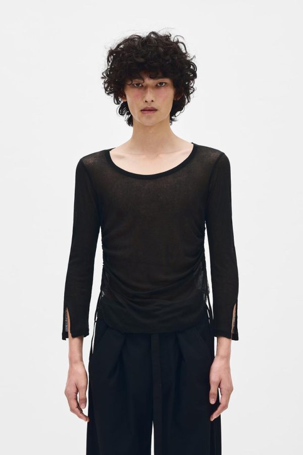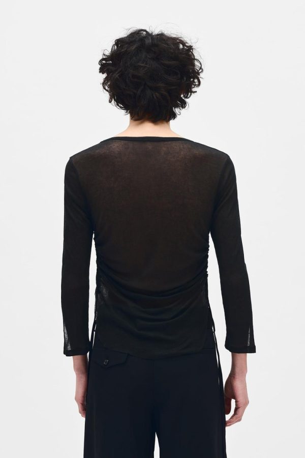 Margon Long Sleeve T-Shirt – Black – Round Neck – Three-Quarter Length Sleeves – Cuff Splits – Ruched – Gathered Sides – Cropped Hem – Slim Boxy Fit – 100% Cotton – Made in Portugal