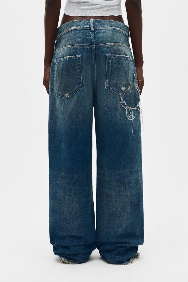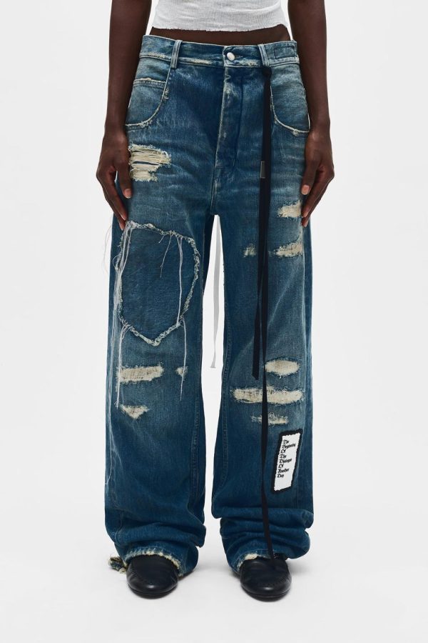 Claire 5 Pocket Comfort Jeans – Vintage Blue – Distressed Denim – Destroyed And Mended Details – Belt Holes – Button Closure – 5 Pockets – Baggy Fit – Floor Length -100% Cotton – Made in Italy