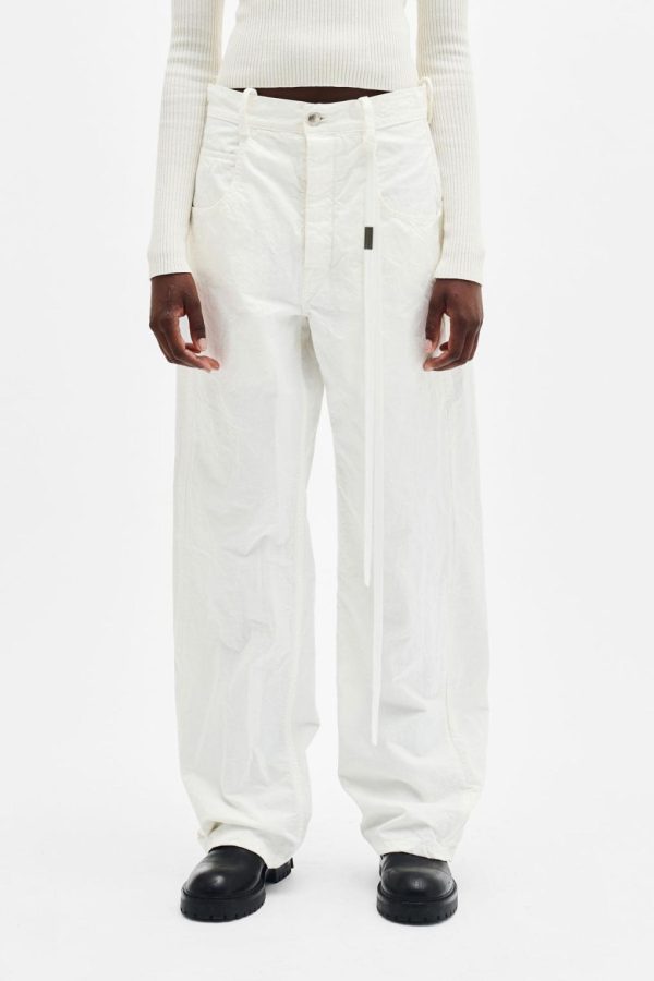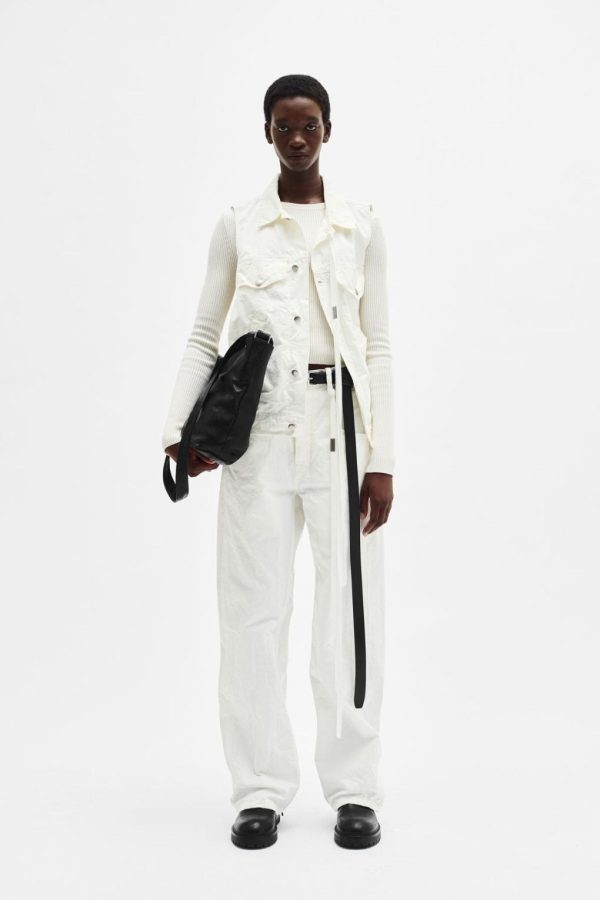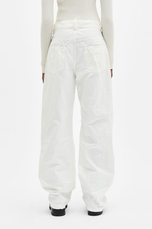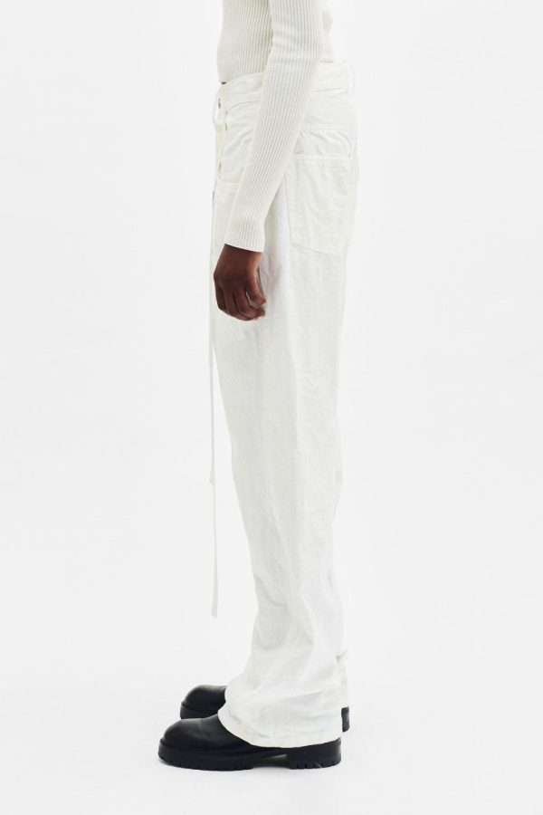 Claire 5 Pocket Comfort Trousers – Natural White – Natural Wash Cotton Denim – Belt Holes – Removable Signature Grosgrain Ribbon – Button Closure – 5 Pockets – Wide Leg – 100% Cotton – Made in Italy